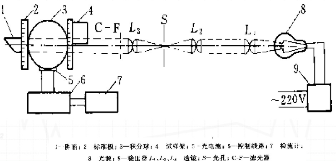 為了準(zhǔn)確的評(píng)定產(chǎn)品的霧度,就可以根據(jù)《透明材料霧度的測(cè)試標(biāo)準(zhǔn)》規(guī)定來(lái)進(jìn)行檢測(cè),該方法源自JIS K7136:2000,適用于板狀、片狀、薄膜狀透明材料。其原理是利用積分球來(lái)進(jìn)行測(cè)量,積分球的效率由于通過(guò)補(bǔ)償而保持恒定,裝置由穩(wěn)定光源、相干光系統(tǒng)、帶孔積分球、帶光探測(cè)器的光度計(jì)、信號(hào)處理器、顯示單元或記錄儀等組成。其原理結(jié)構(gòu)示意圖如下: